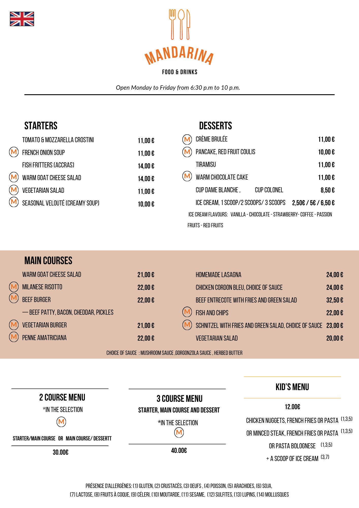- Menu 2 services : 30 euros